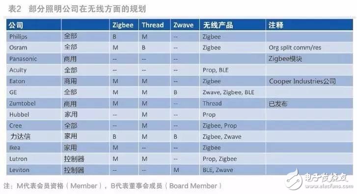 表2說明了這些領(lǐng)先聯(lián)網(wǎng)照明廠商在zigbee/Thread聯(lián)盟中扮演的角色,會(huì)員(M)在聯(lián)盟中是一般身份,而董事會(huì)成員(B)則可以指導(dǎo)聯(lián)盟的發(fā)展方向。在聯(lián)盟中,大家都關(guān)注zigbee、Thread和Zwave的發(fā)展方向,后者是美國(guó)的一種Sub-GHz協(xié)議,即低于1GHz的私有協(xié)議(注:關(guān)注Zwave主要不是因?yàn)檎彰?,而是用于家庭安?。