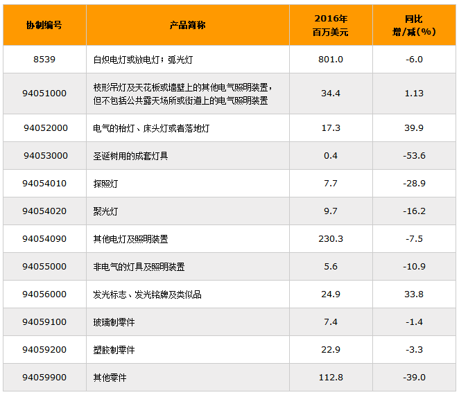 12、2016年中國照明電器及其相關(guān)產(chǎn)品進口摘要如下: