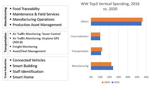 根據(jù)IDC的調(diào)查顯示,從產(chǎn)業(yè)別的角度來(lái)看,是以制造業(yè)的物聯(lián)網(wǎng)市場(chǎng)規(guī)模最大,其次分別是交通運(yùn)輸、消費(fèi)服務(wù)、公有設(shè)施、零售服務(wù)、政府機(jī)關(guān)、健康照護(hù)等產(chǎn)業(yè)為主。 若是從應(yīng)用領(lǐng)域的角度切入,則是以車聯(lián)網(wǎng)、全通路營(yíng)運(yùn)、遠(yuǎn)程醫(yī)療監(jiān)控、個(gè)人健康、智能交通系統(tǒng)、公共安全與緊急響應(yīng)、智能電網(wǎng)、數(shù)字廣告牌、車隊(duì)管理與店內(nèi)推銷等場(chǎng)域應(yīng)用為主。 若是從產(chǎn)業(yè)的角度,從2016年到2020年都是以制造、交通以及一些跨產(chǎn)業(yè)應(yīng)用為主,如圖3。