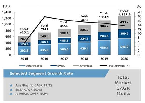 若是從年復(fù)合成長(zhǎng)率這個(gè)角度來(lái)看,則是以EMEA(歐洲/中東/非洲)市場(chǎng)的成長(zhǎng)力道最為強(qiáng)勁,年復(fù)合成長(zhǎng)率達(dá)20%,如圖2。