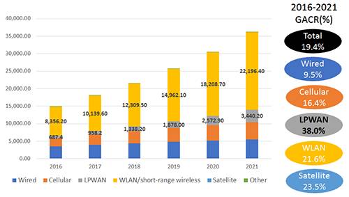 WLAN仍是主流聯(lián)網(wǎng)技術(shù) LPWAN則為后起之秀 IDC預(yù)估,全球的聯(lián)網(wǎng)裝置數(shù)量將從2016年的148.7億個(gè)成長(zhǎng)到2021年的361.3億個(gè),年復(fù)合成長(zhǎng)率為19.4%。