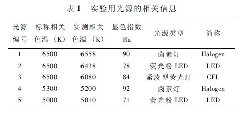 目前的研究主要采用的方法可歸納為: 保持桌面照度或視線方向亮度相同; 并保證各待測光源具有接近的色溫或色坐標(biāo); 被試進(jìn)行的視覺任務(wù)主要有: 考察顏色還原性( 即顯色) 的色差評價(jià); 考察偏好度、鮮艷度、協(xié)調(diào)度等的主觀評分; 考察顏色區(qū)分度的辨色實(shí)驗(yàn)。但目前大多研究均為視覺實(shí)驗(yàn)結(jié)果與顯色指數(shù)CRI 的比較,并已獲得明確結(jié)論,對于CQS 體系的驗(yàn)證僅含顏色偏好度,不含顏色還原性等其他方面的研究,因此還有待完善。此外,大部分視覺實(shí)驗(yàn)針對歐洲人群,由于東西方人群的顏色偏好差異,其結(jié)果未必適用于亞洲人。因此,本實(shí)驗(yàn)對光源的CRI 和CQS 均進(jìn)行了計(jì)算,并基于視覺實(shí)驗(yàn)考量了顏色還原性和顏色偏好度兩方面特性,以期在CQS 系統(tǒng)的可靠性驗(yàn)證方面作出完善,并為顏色質(zhì)量評價(jià)的視覺實(shí)驗(yàn)補(bǔ)充亞洲人樣本。
