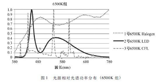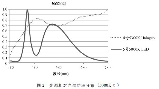 實(shí)驗(yàn)選取了5 種光源,其中2 種鹵素?zé)簟? 種LED 和1 種緊湊型熒光燈(CFL) ,均為市場上的高端產(chǎn)品,其中鹵素?zé)糇鳛橄嗤珳叵碌膮⒖脊庠?。光源基本信息見?, 按照色溫將5 種光源分為6500K 組與5000K 組兩組進(jìn)行,分開進(jìn)行視覺實(shí)驗(yàn)。首先采集了各光源的相對光譜功率分布, 見圖1、圖2,光譜采集儀器為STC3000 光譜儀,然后基于光譜計(jì)算了CRI 和CQS 兩類指數(shù)。