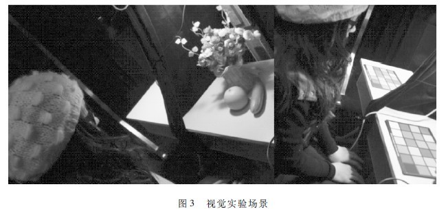 視覺實(shí)驗(yàn)在一暗室內(nèi)進(jìn)行,制成兩個(gè)獨(dú)立的隔間,如圖3 所示。隔間頂部安裝有光源,不產(chǎn)生眩光,均勻照射在桌面上,兩隔間桌面平均照度均為500lx。