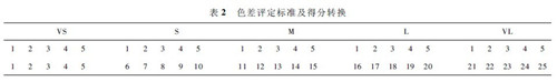 實(shí)驗(yàn)采用被試者內(nèi)設(shè)計(jì)( within-subjects design)的方法,選取10 名被試,其中5 男5 女,年齡為20至24 歲,均具有正常的視力或矯正視力,且經(jīng)過篩選,無色盲等其他眼疾。利用抵消實(shí)驗(yàn)條件的設(shè)計(jì)( reversal experimental condition design) ,每位被試均參與所有實(shí)驗(yàn)條件下的三組實(shí)驗(yàn)任務(wù)。第一項(xiàng)為色差的評分。實(shí)驗(yàn)采用的MCC 色卡是CIE 規(guī)定的用以比較待測光源與參考光源色差的標(biāo)準(zhǔn)方法。實(shí)驗(yàn)時(shí),在兩個(gè)隔間桌面上分別放置MCC 色卡,隔間一邊放置待測光源( CFL 或LED) ,另一邊放置相同色溫的鹵素?zé)糇鳛閰⒖脊庠?,令被試觀察兩套色卡中的24 對顏色樣品,并對每一對的色差進(jìn)行打分。打分的規(guī)則是,首先將色差感受歸入VS ( very small,非常小),S ( small,較小),M (medium,中等) , L( large,大) ,VL ( very large,很大) 五個(gè)大類( 表2) ,然后再進(jìn)行5 個(gè)等級的細(xì)分,最后以諸如VS4,L2 的形式表示。為便于統(tǒng)計(jì)數(shù)據(jù),統(tǒng)計(jì)過過時(shí)將得分轉(zhuǎn)換為末尾行1 ~ 25 的數(shù)字。