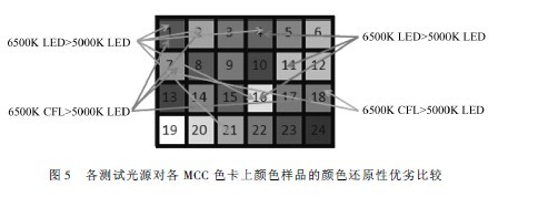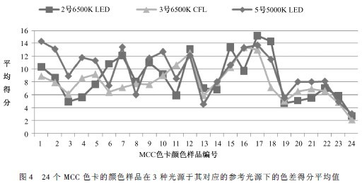關(guān)于顏色還原性, 基于顯色指數(shù)CRI 和美國NIST 提出的CQS 指數(shù)的計(jì)算,6500K 和5000K 的LED 樣品比6500K 熒光燈樣品的顯色性( 顏色還原性) 差,但基于顏色樣品色差評價(jià)的視覺實(shí)驗(yàn),該熒光燈樣品較LED 未見明顯優(yōu)勢,對于不同顏色的樣品,它們的還原性各有利弊。