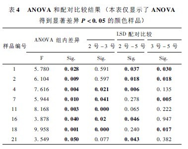 24 個(gè)顏色樣品在不同光源( 2 號6500K LED,3 號6500K CFL,5 號5000K LED) 與對應(yīng)的參考光源( 同色溫的鹵素?zé)? 下的色差得分結(jié)果如圖4 所示。方差分析( ANOVA) 顯示, 對其中8 個(gè)樣品,三種光源在0. 05 的顯著水平下有顯著差異( 見表4)。通過進(jìn)一步的兩兩比較得到各光源在一些顏色樣品下的還原性優(yōu)劣( 見圖5) : (1) 對于樣品4,11,16, 2 號( 6500K LED ) 優(yōu)于3 號( 6500KCFL) ; (2) 對于樣品7,18,3 號(6500K CFL) 優(yōu)于2 號( 6500K LED) ; ( 3 ) 對于樣品1,2,4,16,21, 2 號( 6500K LED ) 優(yōu)于5 號( 5000KLED) ; (4) 對于樣品1,2,7,18,3 號(6500KCFL) 優(yōu)于5 號(5000K LED)。由此可見,對于不同顏色樣品,三種光源(6500K LED; 6500K CFL;5000K LED) 在顯色性能上各有利弊,顯色指數(shù)高的CFL,未顯示出特別優(yōu)勢。