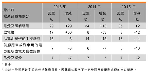 2015年,香港照明產(chǎn)品總出口按年下跌2%。主要產(chǎn)品電燈及照明裝設(shè)出口表現(xiàn)理想,但放電燈及以電池操作的手提燈具出口下跌。