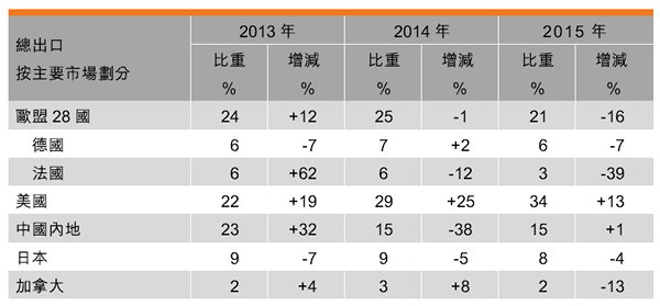 歐盟和美國(guó)都居于最大市場(chǎng)之列,輸往兩地的產(chǎn)品合共占香港照明產(chǎn)品總出口約一半。在2015年,雖然本港對(duì)美國(guó)的出口上升,但對(duì)歐盟的出口卻見(jiàn)失色。