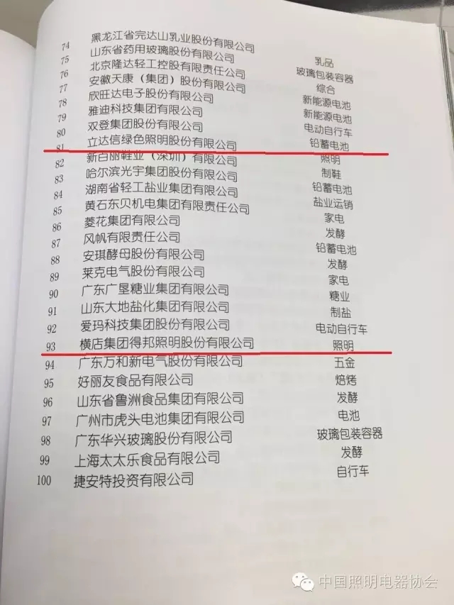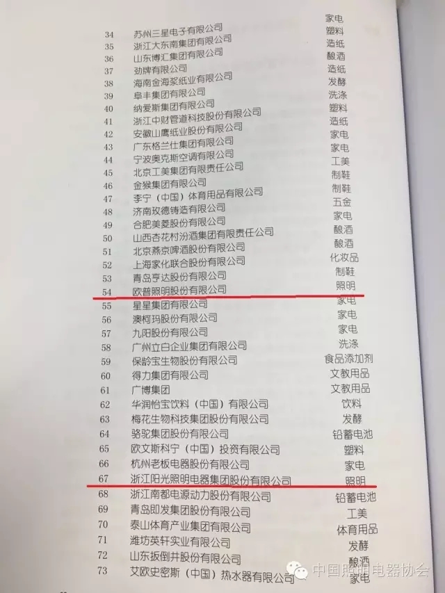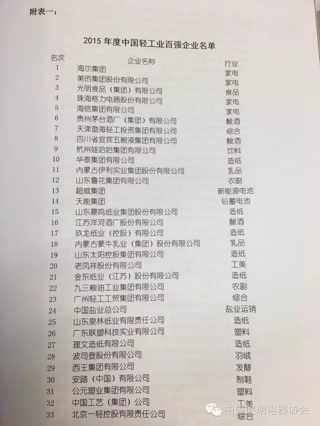 “2015年度中國輕工業(yè)百強(qiáng)企業(yè)”全榜單(來源:中國照明電器協(xié)會)