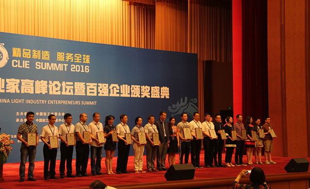 2016年6月15日,中國輕工業(yè)聯(lián)合會在北京舉辦以“精品制造、服務(wù)全球”為主題的“第五屆中國輕工企業(yè)家高峰論壇暨輕工百強(qiáng)企業(yè)頒獎盛典”,并發(fā)布了“2015年度中國輕工業(yè)百強(qiáng)企業(yè)”榮譽(yù)榜單”以及市場能力、盈利能力、價值能力、成長能力、電商能力、財政貢獻(xiàn)及科研投入等七大分項能力百強(qiáng)榜單。