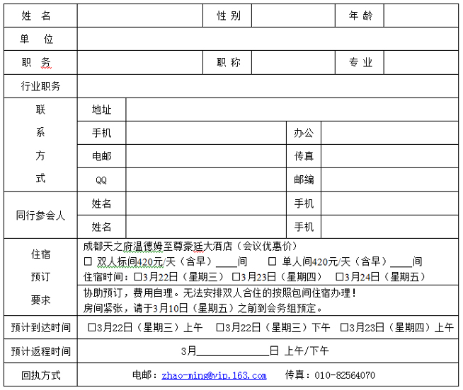 3、預(yù)訂住宿的回執(zhí)接收截止時(shí)間為2017年3月10日,逾期者不能保證提供客房。請予以重視!