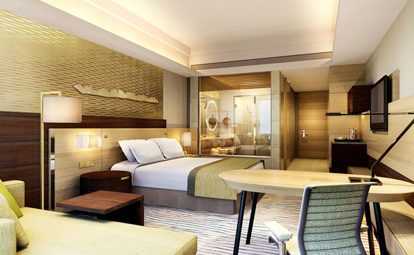 客房是客人最重要的睡覺和休息的地方,燈光設(shè)置需要營造溫馨舒適的燈光環(huán)境。床頭照度150lx,寫字臺照度300lx,其他活動區(qū)照度75lx,色溫2500-3000K,顯色指數(shù)>80。