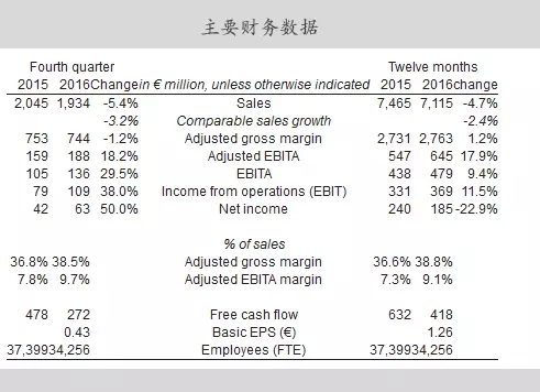 銷售額高達(dá)71.15億歐元,可比較銷售額衰退2.4%; 業(yè)務(wù)盈利能力同比持續(xù)提升; 調(diào)整后息稅折舊攤銷前利潤(rùn)(Adjusted EBITA)為6.45億歐元,2015年僅5.47億歐元; 調(diào)整后息稅折舊攤銷前利潤(rùn)率增長(zhǎng)了180個(gè)基點(diǎn)至9.1%,2015年僅7.3%; 凈收入達(dá)1.85億歐元,2015年高達(dá)2.4億歐元; 自由現(xiàn)金流達(dá)4.18億歐元,2015年為6.32億歐元。