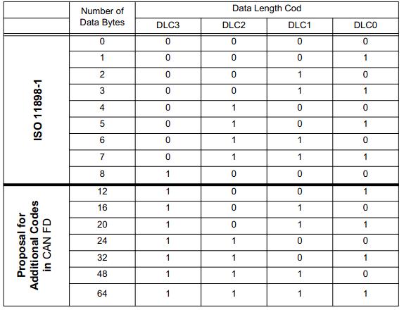 CANFD 數(shù)據(jù)幀采用了新的新的DLC編碼方式,在數(shù)據(jù)場(chǎng)長(zhǎng)度在0-8個(gè)字節(jié)時(shí),采用線性規(guī)則,數(shù)據(jù)場(chǎng)長(zhǎng)度為12-64個(gè)字節(jié)時(shí),使用非線性編碼。如下圖: