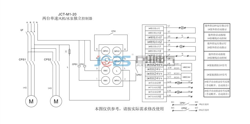 17 WCPS-45M/3/45A WCPS-45M/3/45A RQ RQ XHM1-33- 18 R R XINLING 設計舉例 XINLING 應用舉例 下圖為傳統(tǒng)的常用的排水泵一用一備全壓起動控制電路圖,具有就地手動和事故自投的功能,符合 D303-2~3《常用電機控制電路圖》XKP-5-2,等同于巨川二次圖集的CPSC-278。 二次電源 溢流水 及保護 位報警 液位繼電器 兩泵 消除音響 溢流水 位報警 故障 及試鈴 工作泵故障轉換 控制變壓器 及樓宇外控 L2 1FU XT1:5 KA1 KA3 KA1 SL2 CPS1 SBT KA3 1用2備 KA1 1 K1 9 10 ~24V XT1:9 SL3 XT1:6 CPS2 XT1:7 SA 手動 2用1備 K KT1 T XT1:10 2 SL1 KA4 CPS1 CPS2 正常電源 XT1:8 SBR KA4 K1 t ~ 備用電源 M HW N KA3 KA1 自動 事故 控制 自投 3HY HA KA4 KT1 就地 手動控制 KA2 自動 事故 控制 自投 信號指示 運行 短路 故障 至 污 水 池 液 位 器 至 電 訊 控 制 系 統(tǒng) XT 5 6 7 8 9 10 11 12 13 14 L1 L2 L3 N PE CPS1 CPS2 1U 1V 1W 2U 2V 2W 1P M 二次電源 就地手 及保護 動控制 信號指示 運行 短路 故障 L2 2FU KA1 5 6 3 4 注: