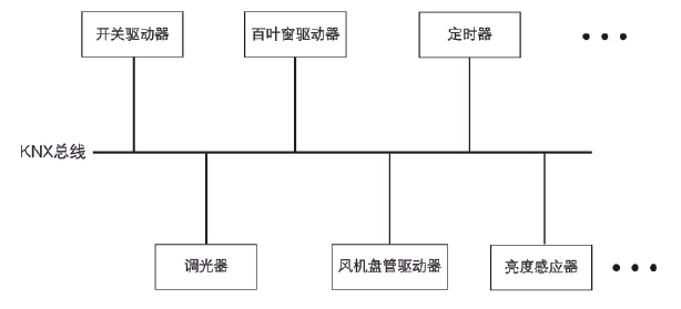 ,KNX系統(tǒng)的工作原理是利用信號控制總線,把系統(tǒng)各個設(shè)備連接在總線上,通過軟件編程或智能面板,設(shè)定控制設(shè)備(面板、傳感器、定時器等)和受控設(shè)備(開關(guān)驅(qū)動器、調(diào)光驅(qū)動器等)之間的關(guān)系,包括控制設(shè)備所能控制受控設(shè)備的數(shù)量、方式、觸發(fā)條件等等。