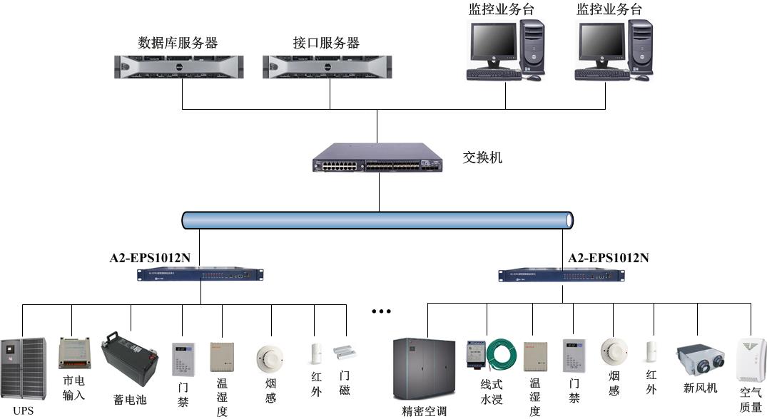 機(jī)房監(jiān)控單元現(xiàn)場傳輸一般采用TCP/IP方式,傳輸組網(wǎng)設(shè)備統(tǒng)一采用集中數(shù)據(jù)采集器A2-EPS1012N或A2-EDSU,具體數(shù)量根據(jù)監(jiān)控內(nèi)容、采集方式、測點數(shù)量而定。